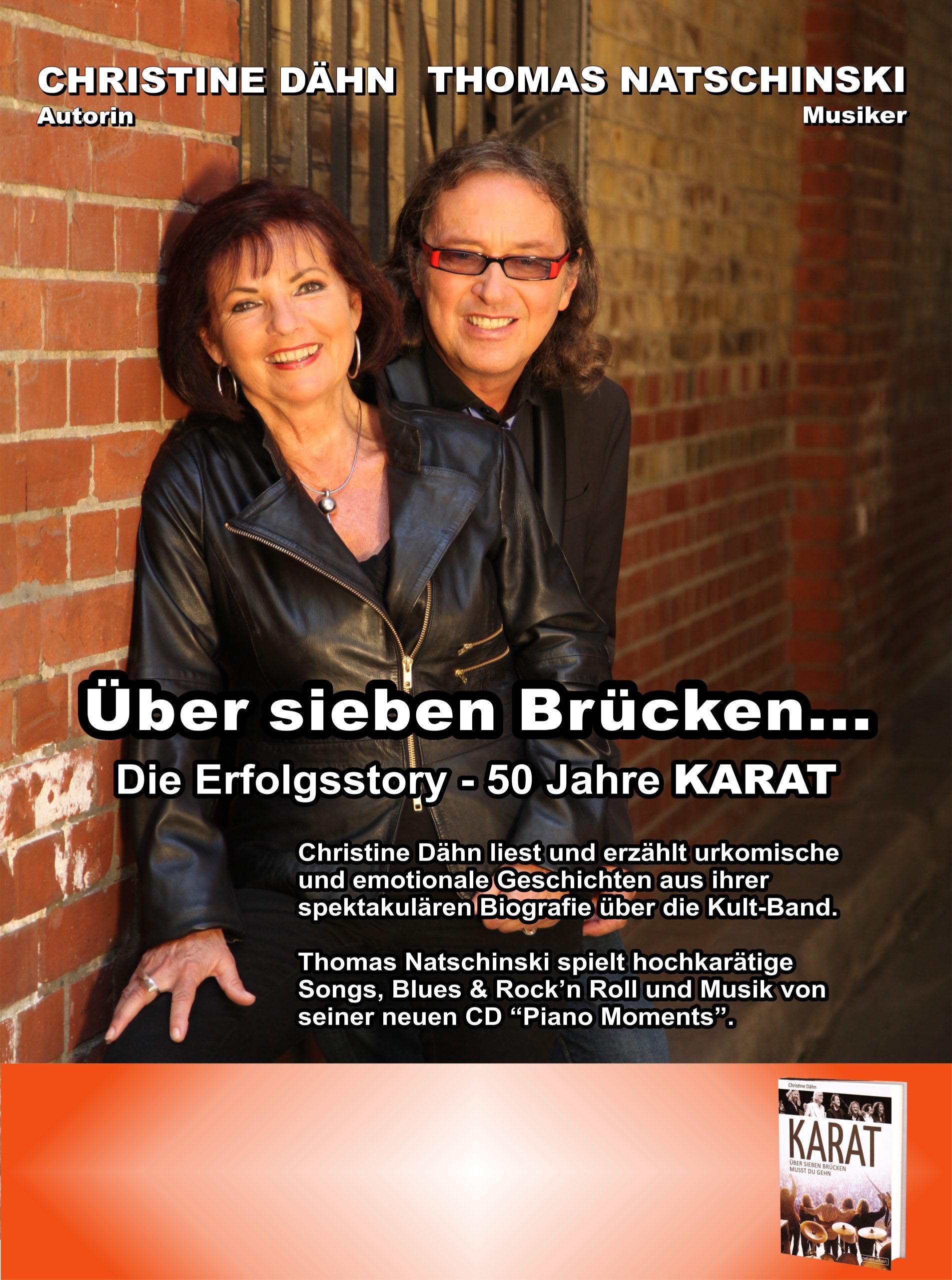 Mit hochkarätigen Songs, Blues und Rock’n Roll begeistert er in der Konzertlesung die Zuschauer und Christine Dähn mit aufregenden, poetischen und urkomischen Geschichten aus dem Leben der Karatmusiker, die in Ost und West mit ihren Songs wie „Albatros“ und „Der blaue Planet“ ihre Fans begeisterten.